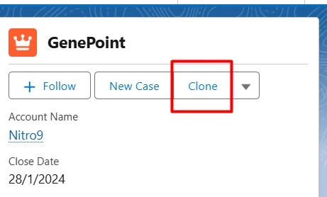 On the opportunity record page, locate and click the “Clone” button. This action initiates the duplication process.