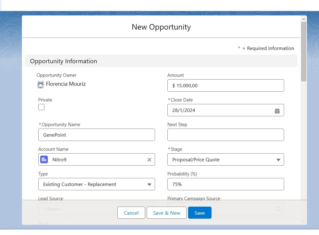After cloning, Salesforce will display the new opportunity with pre-filled data from the original record. Review the information and make necessary changes, such as updating the opportunity name, close date, or other relevant details.