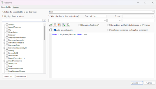 XL-Connector also makes it easy to pull Salesforce data into Excel using SOQL, whether experienced or new. Just click “Get Data” in the ribbon. Experts can enter queries directly, while beginners can use the query builder to select objects and fields without coding. Data can be placed anywhere in the sheet, even across different columns.