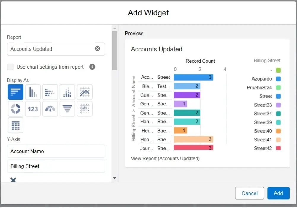 - Click + Widget and choose the report you want to visualize.