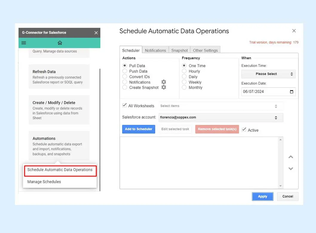 G-Connector offers the possibility to schedule any operation as frequently as once an hour. There are multiple options of frequency to select from. It’s possible to schedule each tab separately at different times. Offline users can edit a spreadsheet in the field, then sync with Google when online. The automatic push operations will kick in on the schedule and push any changes to Salesforce.