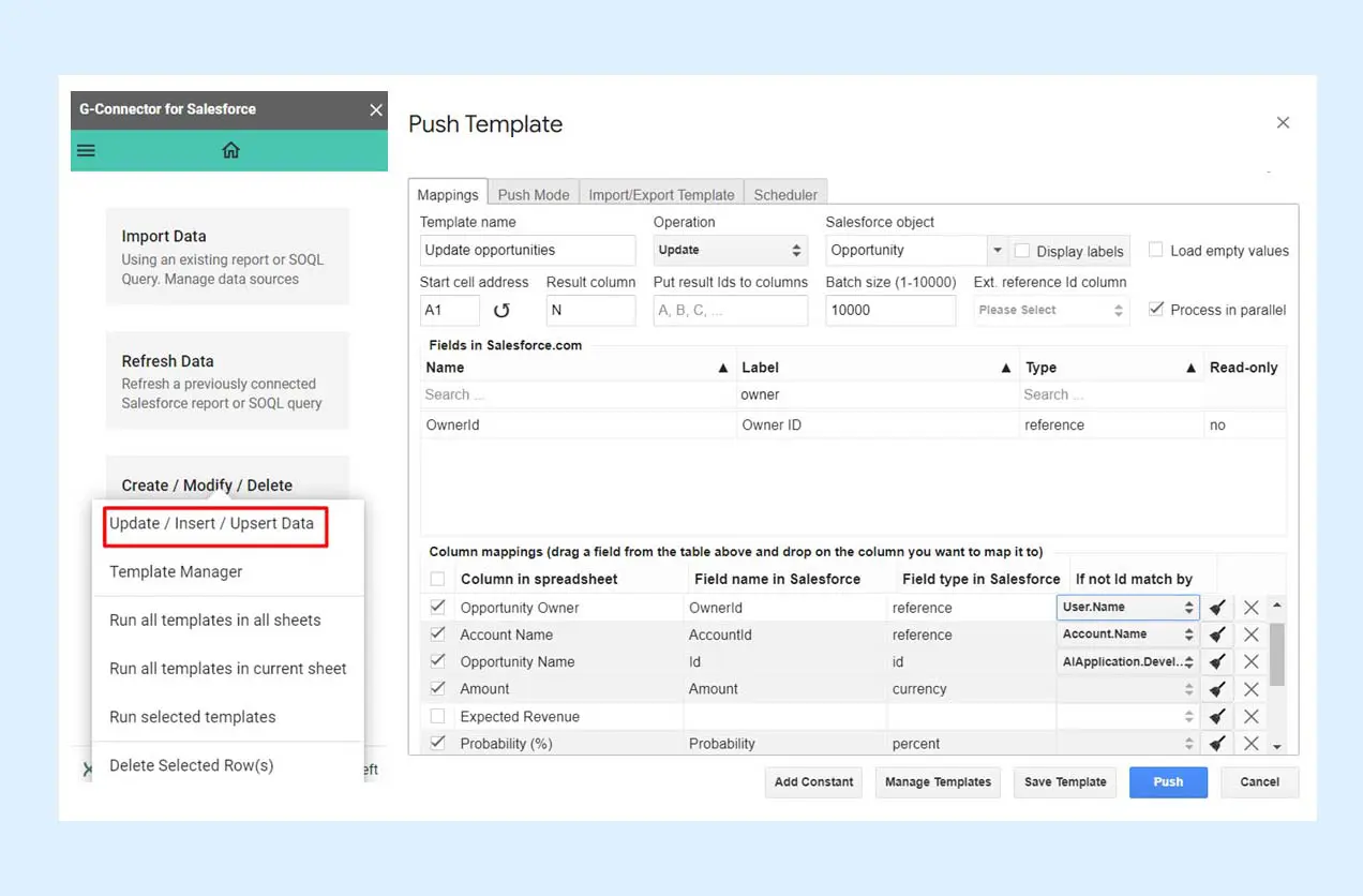 G-Connector, on the other hand, doesn’t impose any restrictions as to the number of records one can work with. This makes it the tool of choice when working with large reports and substantial amounts of data. Besides, G-Connector has a built-in functionality of looking up record Ids based on their names, which comes in handy when users don’t have an ID column when having to update records.