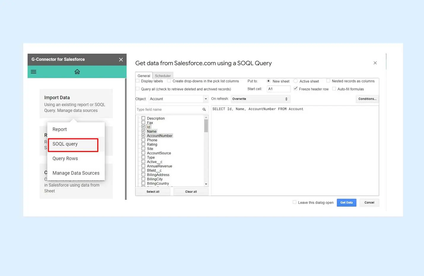 Google Data Connector for Salesforceallows users to pull data from Salesforce into Google Sheets using Salesforce Object Query Language (SOQL) queries. This functionality enables users to extract specific data sets by crafting precise queries, filtering, sorting, and aggregating data based on various criteria. By importing the queried data directly into Google Sheets, users can manipulate, visualize, and analyze the information in a familiar environment. This capability streamlines data management by reducing manual data transfers and enabling real-time data updates, which is particularly beneficial for dynamic and complex data analysis and reporting.
