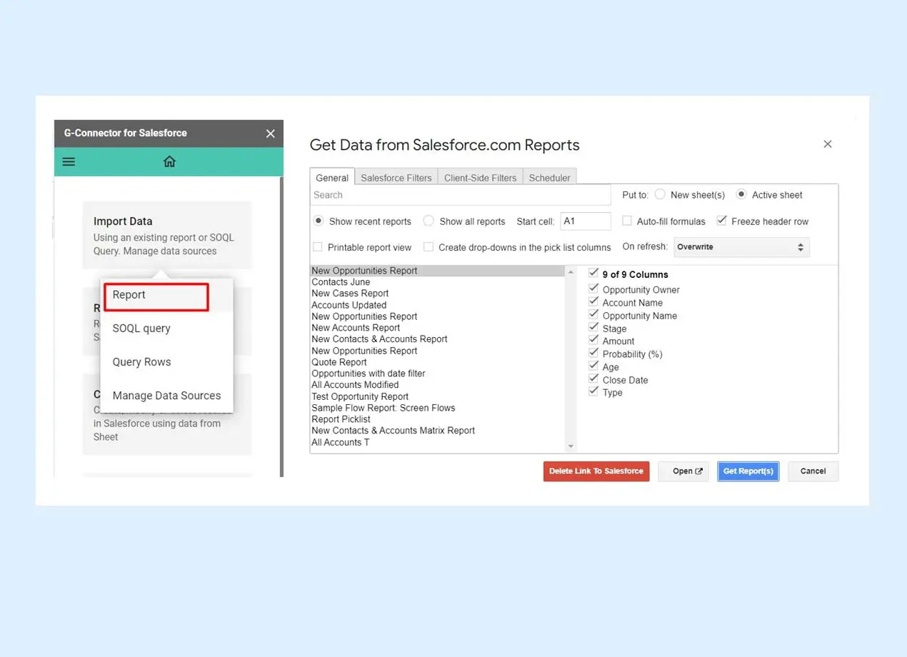 Google Data Connector for Salesforce enables users to pull Salesforce data into a familiar spreadsheet environment. The connector supports scheduled data refreshes every 4, 8 or 24 hours, ensuring that the information in Google Sheets is always up-to-date with the latest Salesforce reports. However, it has a limited customization in terms of how data will look in the spreadsheet.