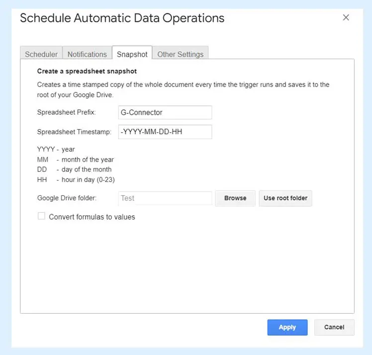 G-Connector has a built-in feature to automatically create snapshots of the data on a desired frequency, and save each snapshot to a selected folder in the user’s Google Drive.