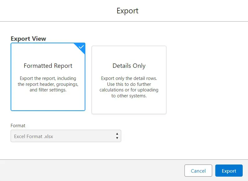 If checked, the report will be exported in Formatted view. By default all reports are exported in Detail view, similar to the how you choose the export view in Salesforce: