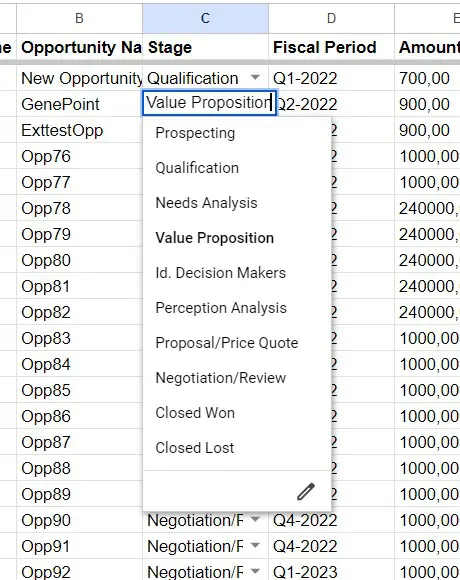 If checked, we’ll add a drop-down into each cell of a column coming from a ‘picklist’ field in Salesforce as follows: