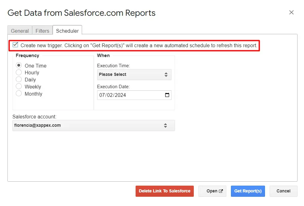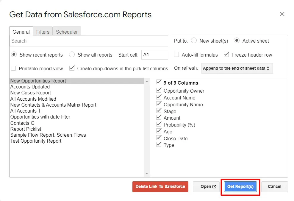 (Not all reports allow filters customization. If this tab is grayed out – the report filters are not customizable from the G-Connector end. Please edit them directly at Salesforce) - Put to: New sheet(s) or Active Sheet