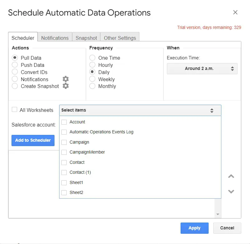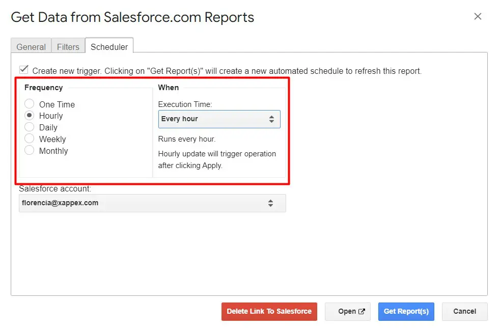 Automatic data pulls are an amazing way for saving on Salesforce licenses for those users who only need read-only access to the system. With G-Connector, you can pull data from Salesforce into a Google Spreadsheet, share that spreadsheet with anyone using Google Drive, and schedule automatic offline refreshes as frequently as once an hour directly from its scheduler.
