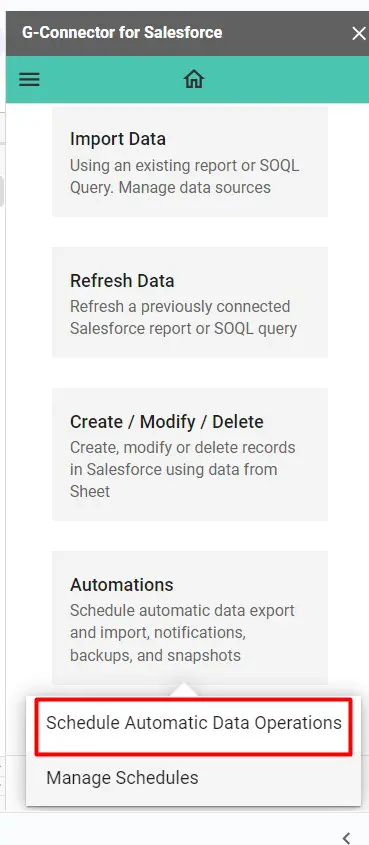 - When you have already pulled a report to a spreadsheet, you can schedule its refresh by clicking Automations –> ‘Schedule Automatic Data Operations’: