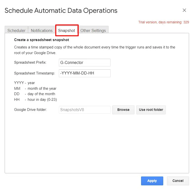 - The Scheduler feature of G-Connector also allows you to set up data snapshots to be created in your Google Drive over time to keep track of historical data.