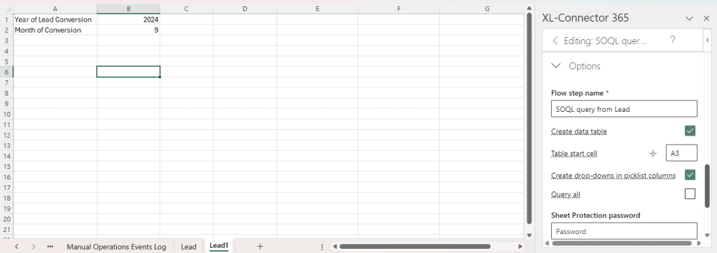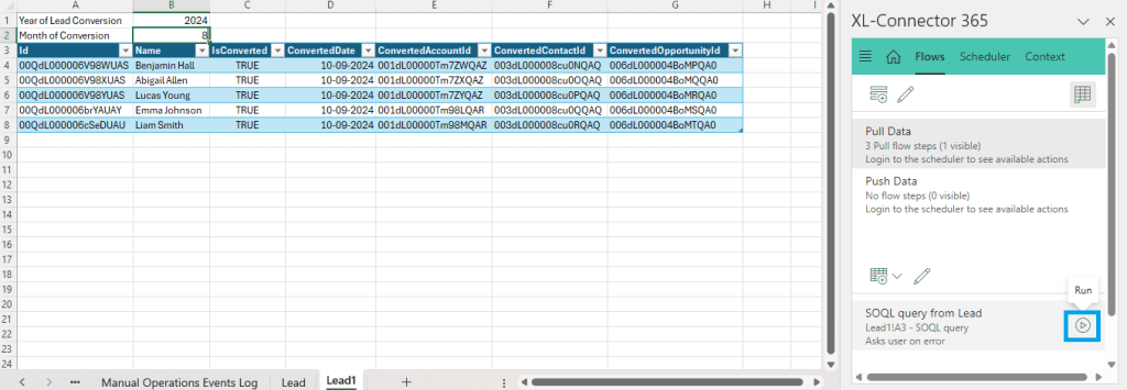 Extract Data: Use XL-Connector 365 to pull the lead data from Salesforce for the current month. We use SOQL queries to get details about the converted leads, including their conversion dates and related information such as Account Id.