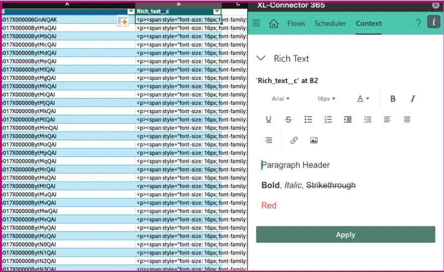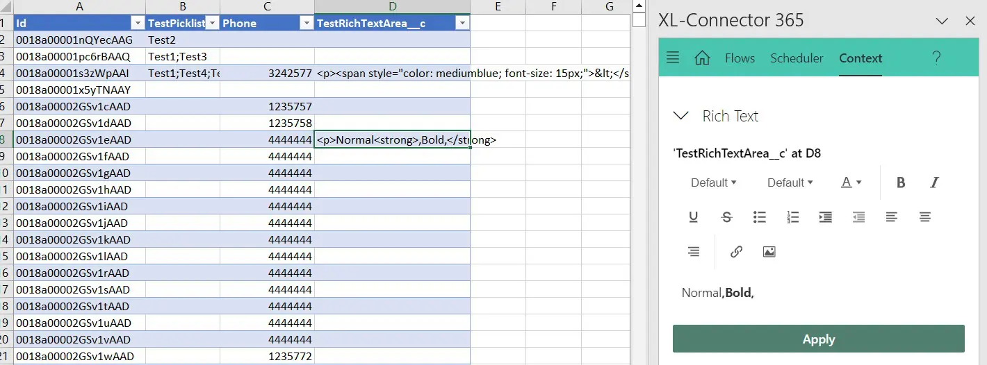 Luckily, XL-Connector 365 has a solution for that: the Context tab will render any html in an Excel cell to a readable format and let you edit it, saving the results back to the sell as HTML so that you could update it in Salesforce: