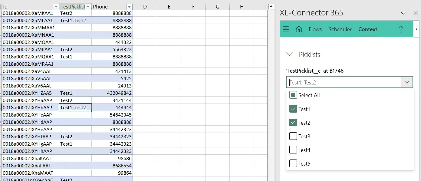 - Modify the values in the picklist column as required.(This can be very simple if you’ve pulled your data with XL-Connector or G-Connector, since they provide the possibility to create drop-downs for picklist columns). If it’s a multi-select picklist, XL-Connector and XL-Connector 365 provide special tools for editing them without having to remember to separate the items in the list with semicolumns.