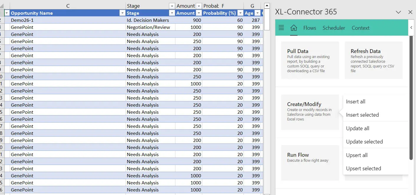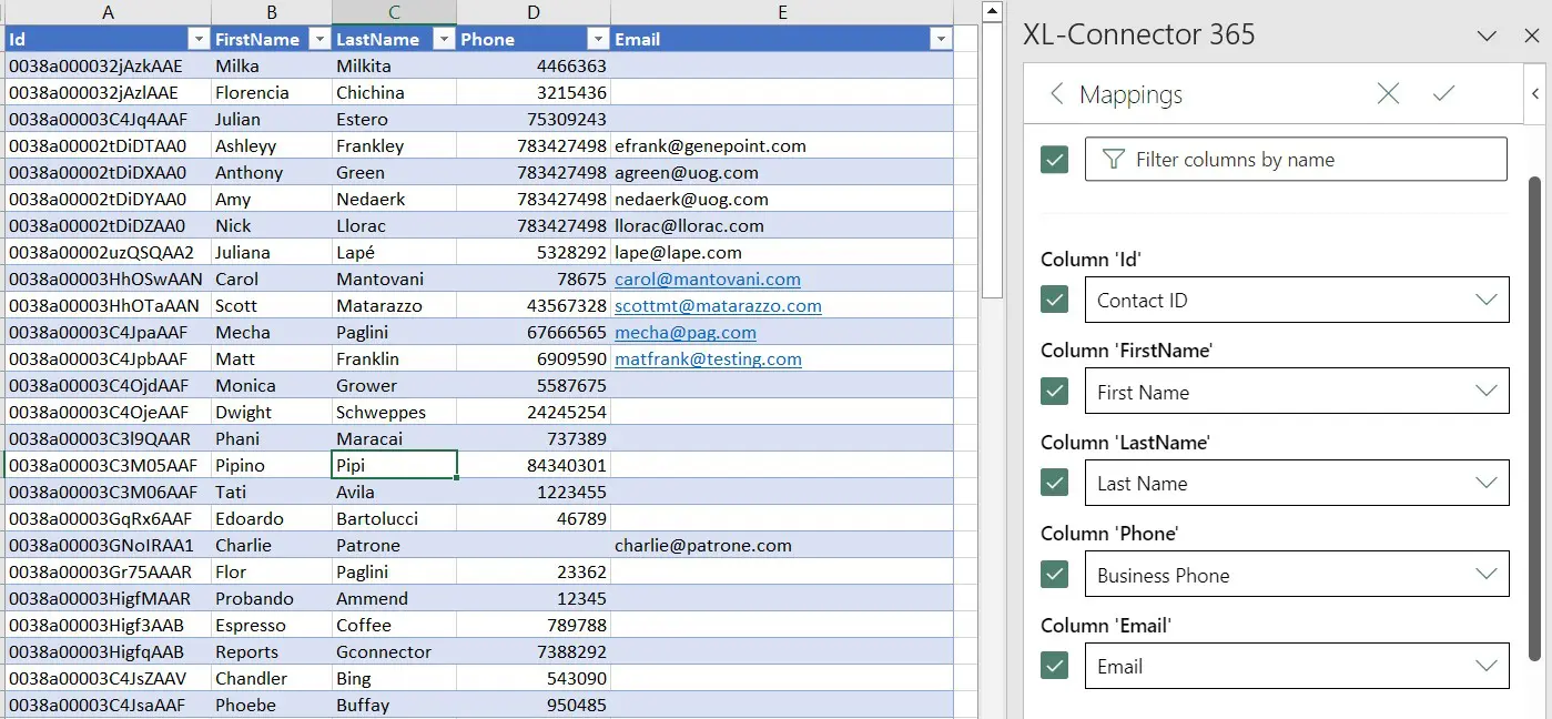 These are XL-Connector or XL-Connector 365 for Excel and G-Connector for Google Sheets. They are built into Excel and Google Sheets directly, which makes it possible to work with the data in a spreadsheet, and then feed it to a mass update, insert, or delete job with reusable mappings saved and accessible right in there in the same worksheet and pulled automatically for you.