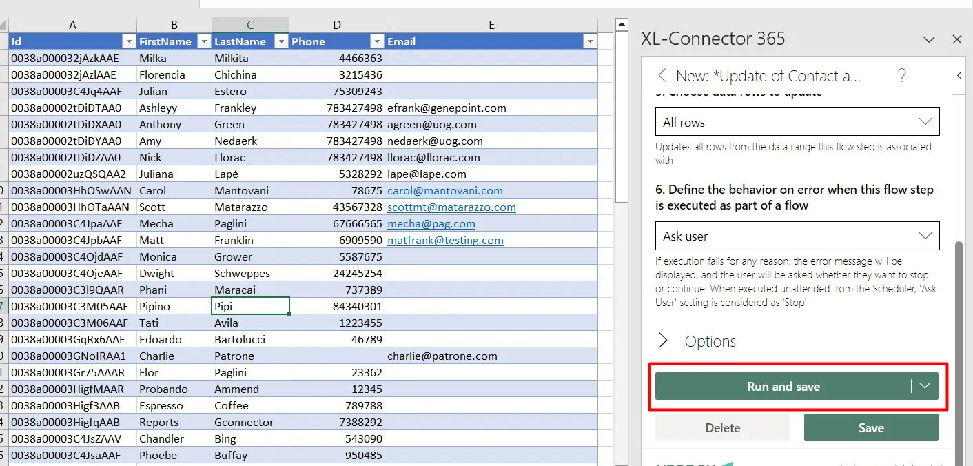 Click Update/Insert/Delete: Once you’ve made the required changes, go to the corresponding connector´s tabUI, and select the “Update” operation from the Create/Modify section or ‘Delete’ from the Delete/Restore section. You can choose to do it on all the records in your spreadsheet or selected records. (If you choose ‘Update Selected,’ the selection should span across all the records that we want to update).