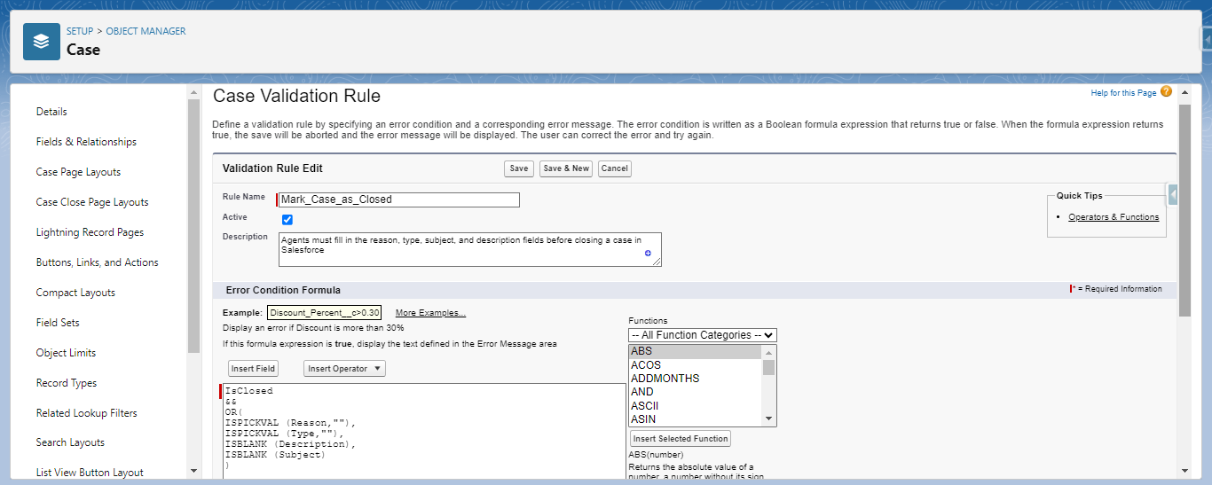 For example: Agents must fill in the reason, type, subject, and description fields before closing a case in Salesforce to collect consistent data for analysis.