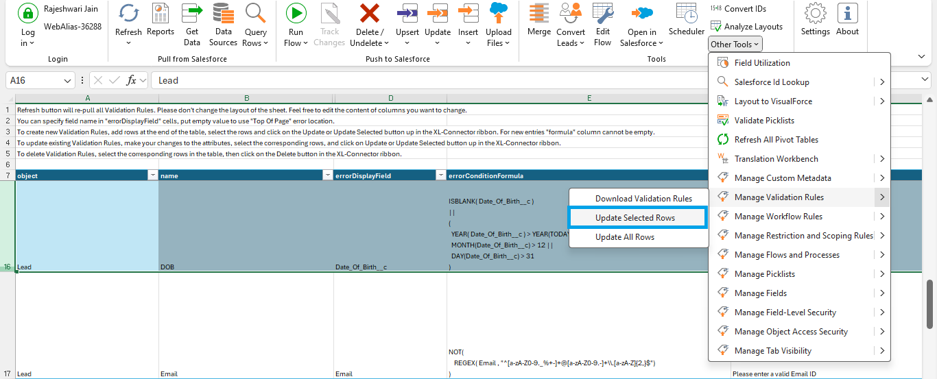 Ever need to make changes to a bunch of validation rules in Salesforce at once? Bulk editing using XL-Connector can be a real time-saver! This section will show you how to download all your validation rules, make edits, and upload them back to Salesforce using XL-Connector.
