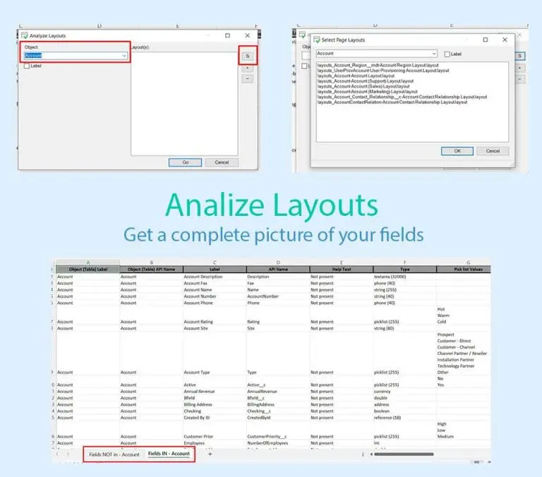 - Analize Layouts: get a complete picture of your fields and what page layouts they are used (or not used) in. XL-Connector has a built-in feature called Analyze Layouts.