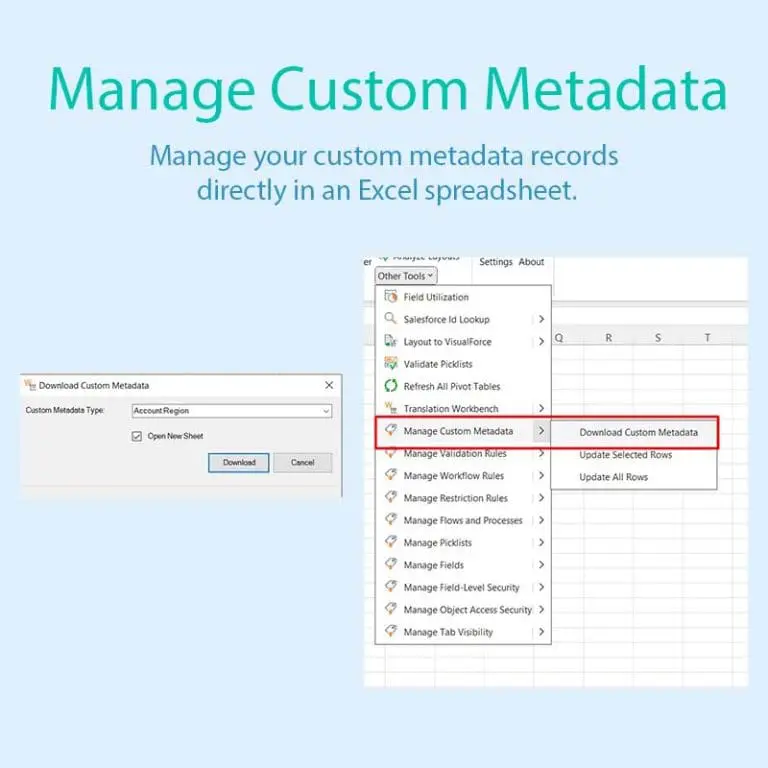 - Manage Custom Metadata: you will be able to load, create, import and manage your custom metadata records directly in an Excel spreadsheet.