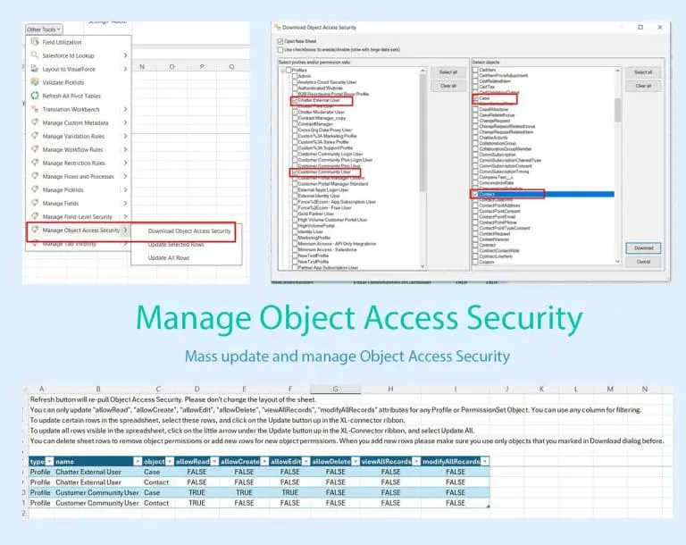 - Manage Field-Level Security: mass update and manage Field-Level Security for your Salesforce fields directly from your Excel spreadsheet. You can quickly download all Field-Level Security for any combination of Profile(s)/Permission Set(s) and Object(s), adjust their security settings (visible and read-only), and update back to Salesforce all at once.