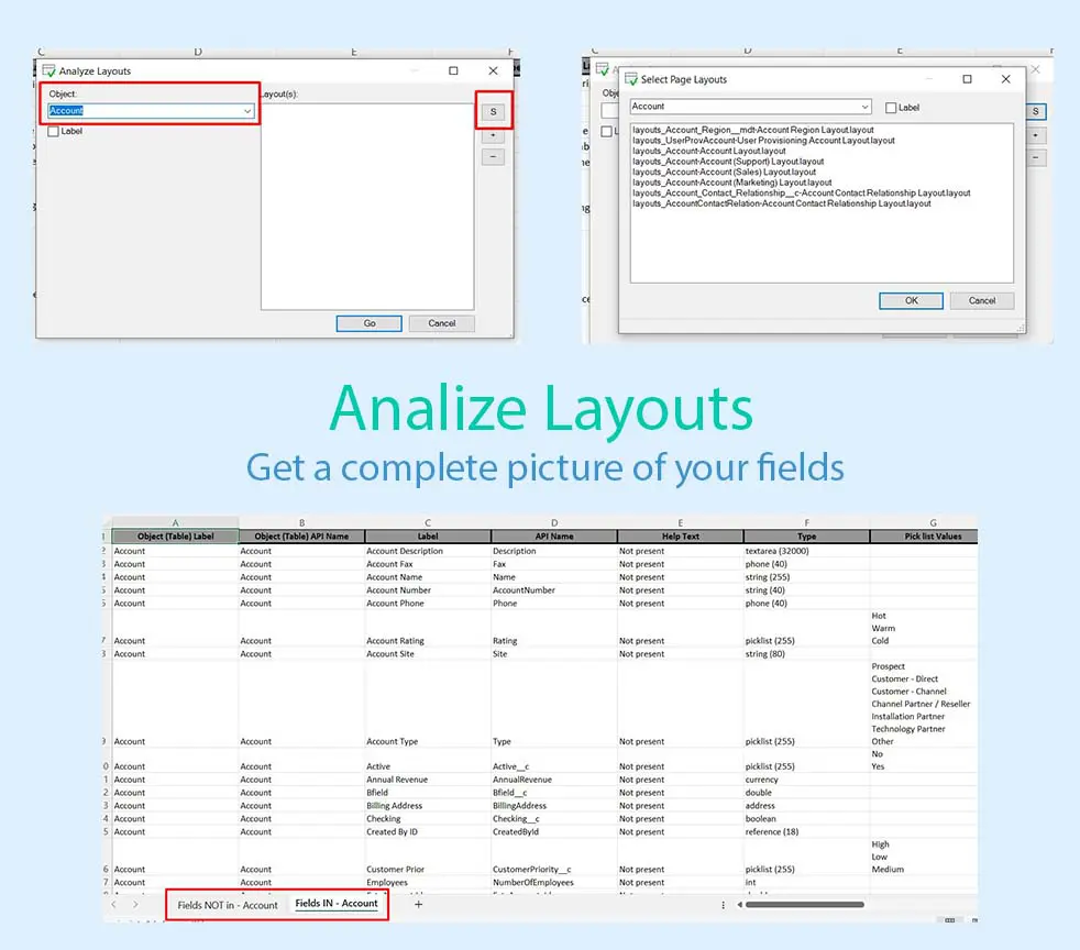 - Analize Layouts: get a complete picture of your fields and what page layouts they are used (or not used) in. XL-Connector has a built-in feature called Analyze Layouts.