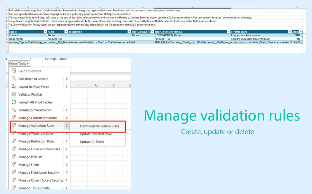 - Manage Validation Rules: Create, update or delete validation rules right from your spreadsheet.