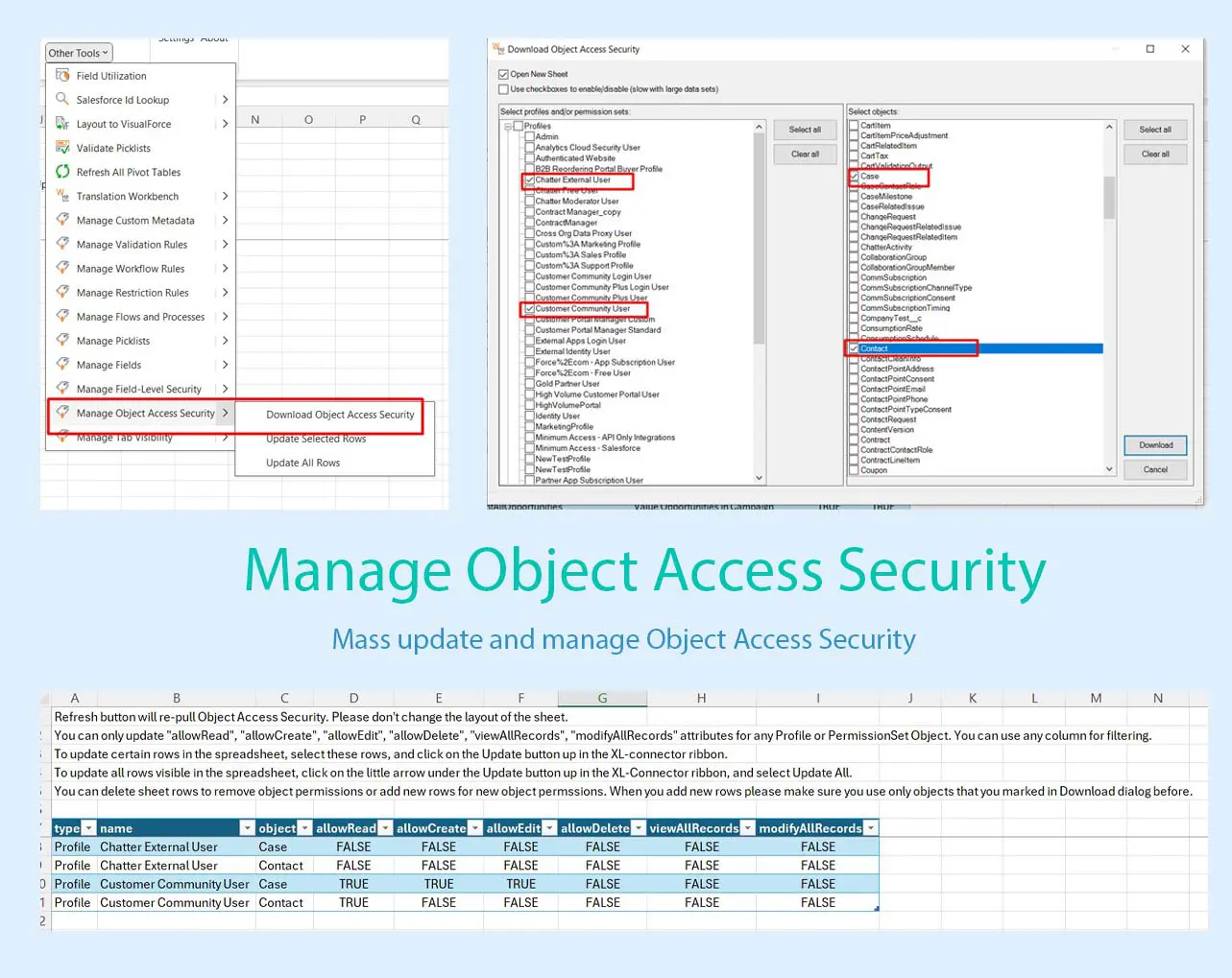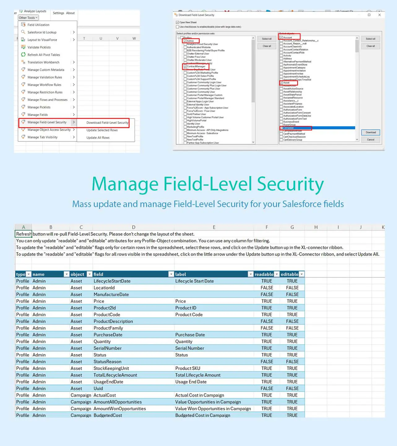 - Manage Field-Level Security: mass update and manage Field-Level Security for your Salesforce fields directly from your Excel spreadsheet. You can quickly download all Field-Level Security for any combination of Profile(s)/Permission Set(s) and Object(s), adjust their security settings (visible and read-only), and update back to Salesforce all at once.