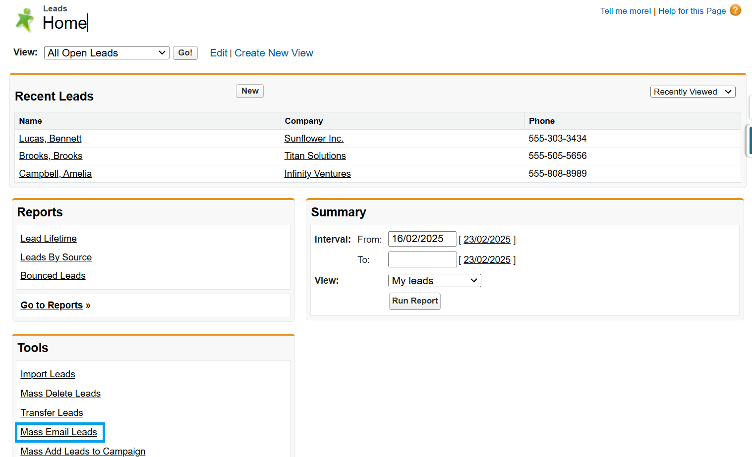In Salesforce Classic, open the Tools section on relevant tabs (such as Contacts or Leads) to access mass email features. Then, use the Mass Email Contacts/Leads links to send your emails.