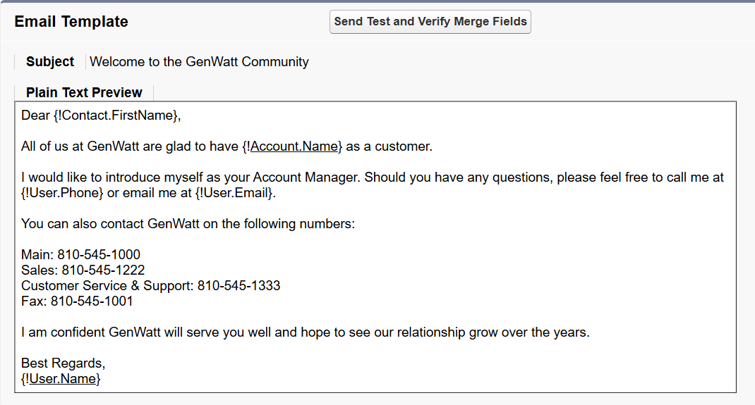 When you preview your email template, merge fields like {!Account.AccountNumber} display as written. When you send an email, Salesforce fills these fields with data from each recipient’s record or uses substitute text if no data is available.