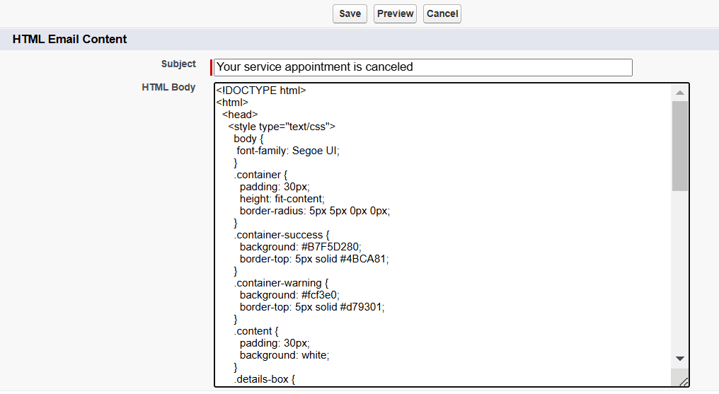 These use Salesforce’s Visualforce language to pull data directly from Salesforce records. They work well for emails that need to incorporate data from multiple sources or require specific logic.