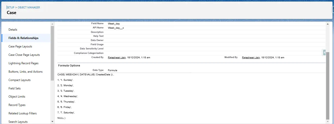 Open the Case object and select “Edit Object” from the gear icon. Navigate to “Fields & Relationships” and click “New Field.” Choose “Formula” as the field type, set the result type to “Text,” and use the following formula: