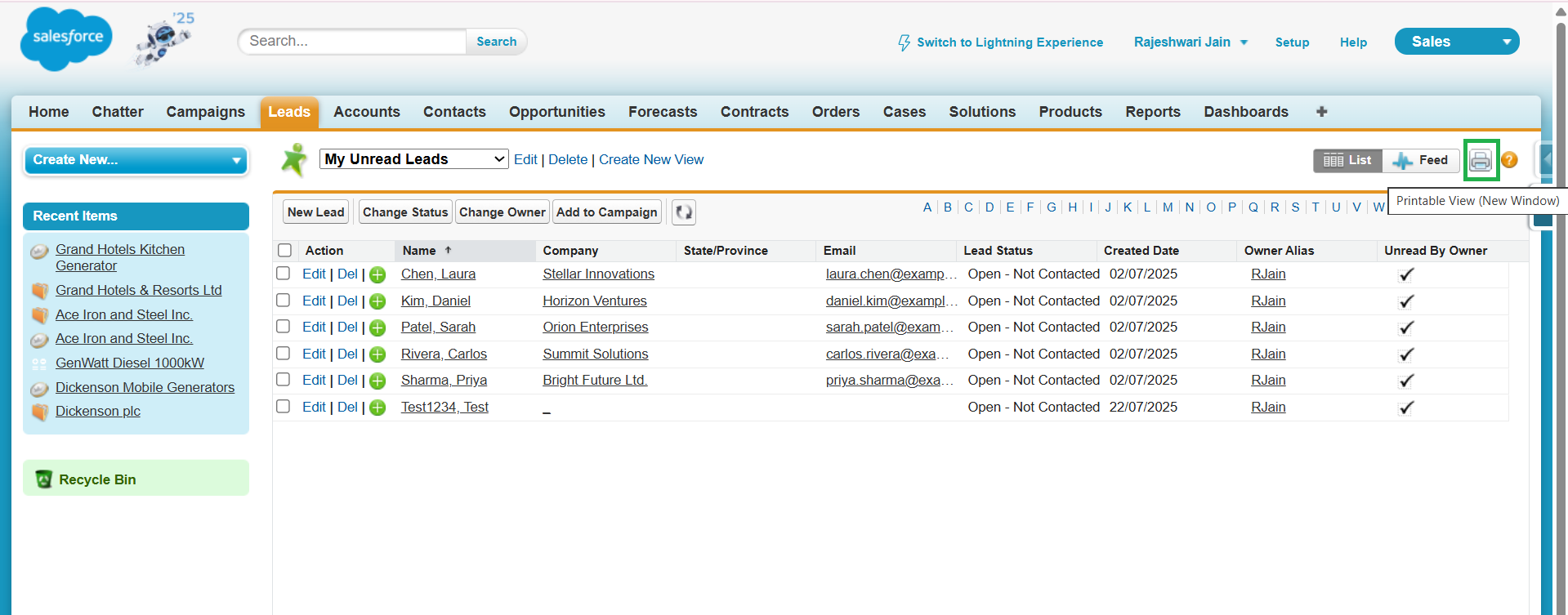 Salesforce doesn’t include a direct Export button for List Views, but there are several ways to export the data, depending on your needs. If you want a quick copy, the Printable View is a good option. For a more organized format, Reports are the best fit.