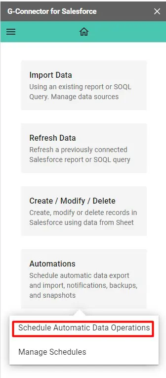 Go to the G-Connector for the Salesforce menu and select “Schedule Automatic Data Operations”.