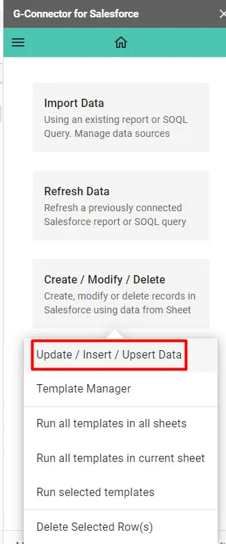 Once you’re in your Google Sheet, go to the “G-Connector for Salesforce” menu and select “Update/Insert/Upsert Selected Row(s).” This will initiate the process of transferring data from Google Sheets to Salesforce.
