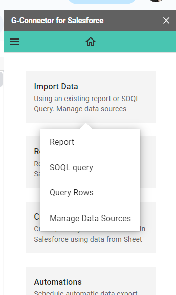 For pulling data from Salesforce and saving it on Google Sheets, click on “G-Connector for Salesforce” option and select “Import Data”–> “SOQL query.” This will open an advanced query editor within your Google Sheet, making it very convenient.