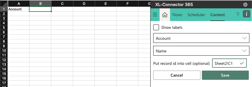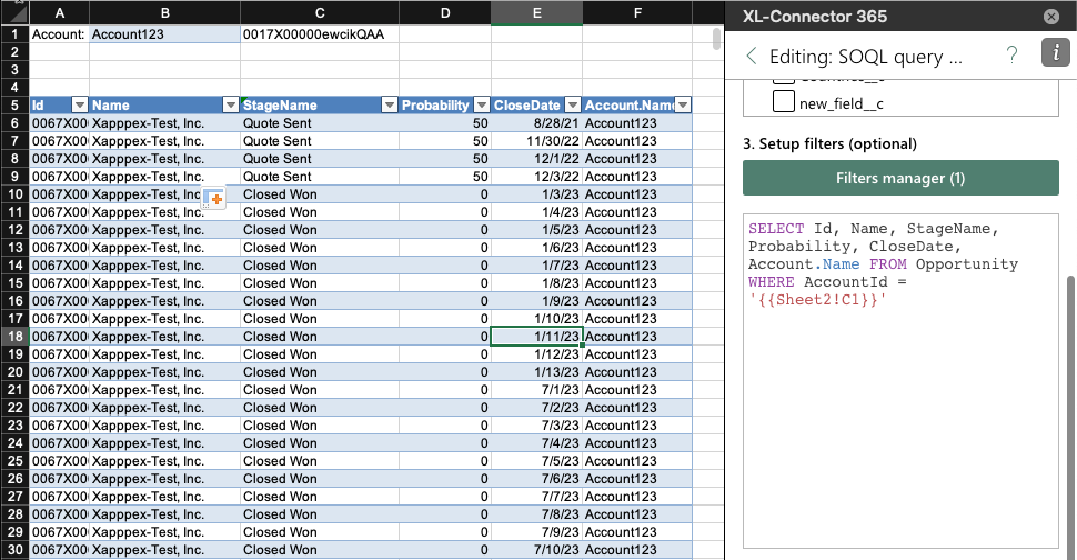 Once this is set up, any user of this workbook with XL-Connector 365 installed will be able to search for a specific Account record in Salesforce and populate cell B1 (in the example above) with the Account name, and cell C1 – with the Account Id.