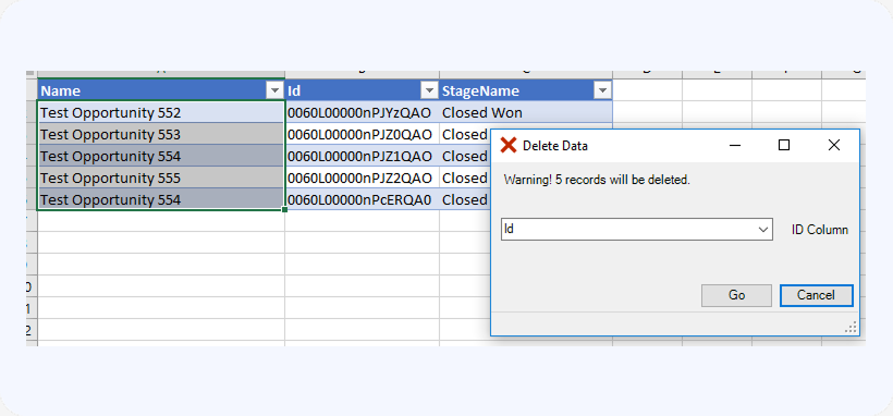 So as long as you have a column of record IDs in your spreadsheet, you can select the rows you want deleted from the Salesforce.com database, click Delete button, confirm the deletion, and you will be all set.