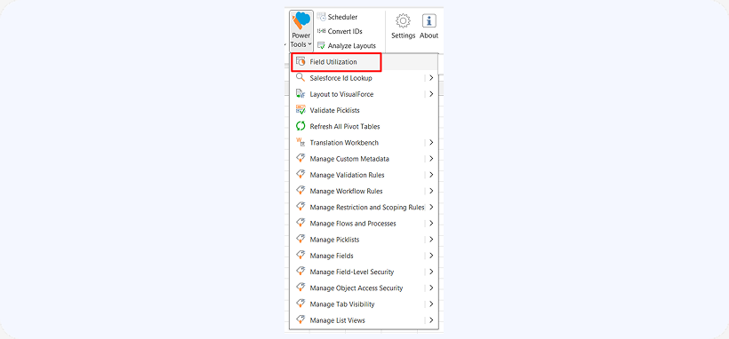 This is where Field Utilization tool of XL-Connector will come in handy. First, open an empty worksheet in Excel, then click Power Tools –>Field Utilization.