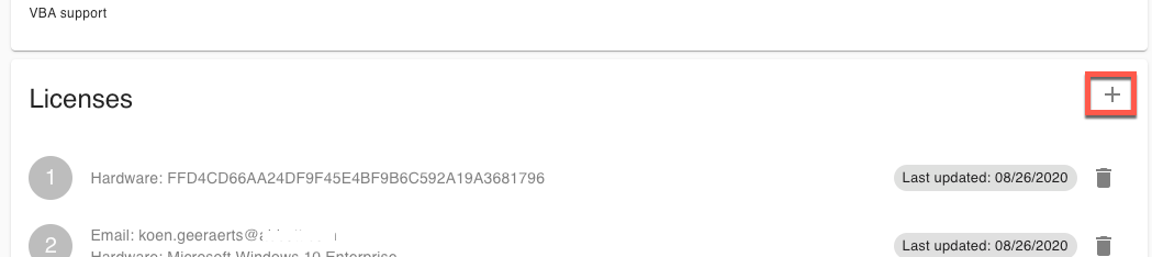 - Under the Licenses section, click on the Plus icon to add a new license: