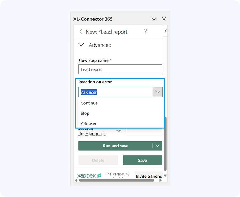If this report will be run as a part of a Flow – you have an option to set the behavior in case the report pull results in an error. The options are: