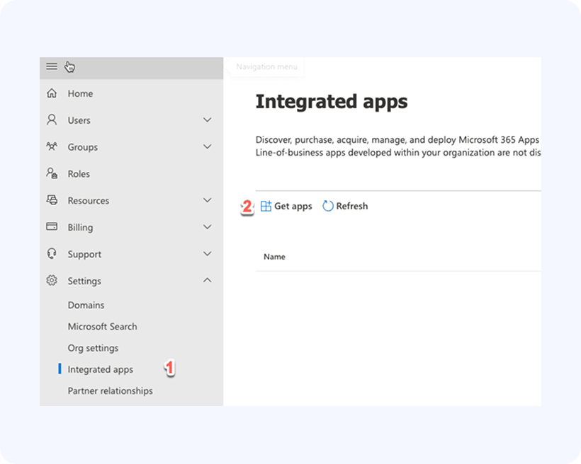 In the Admin dashboard, locate the menu on the left, click on Show All, and then click on Settings -> Integrated Apps, then click on Get Apps: