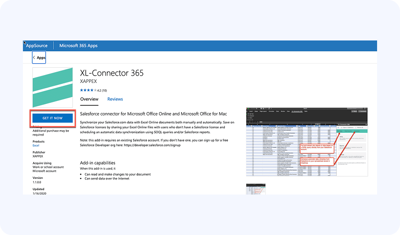 In the subsequent dialog box, search for “XL-Connector 365” and press on Get it Now: