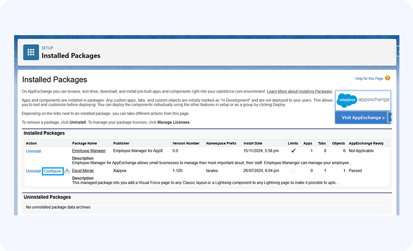 In the list of managed packages, click Configure next to the XL-Connector Templates managed package: