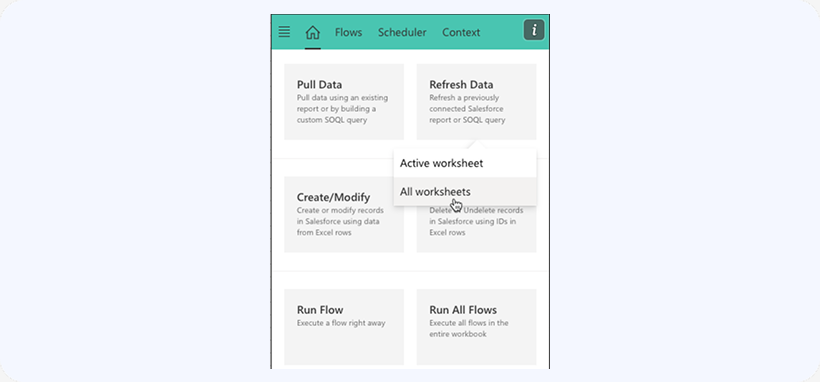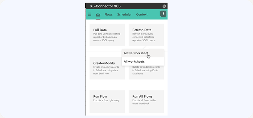 When running a SOQL query or Salesforce report, a link is established between the data range and Salesforce so that you could always refresh the data from Salesforce later by clicking on the Refresh button and selecting Active worksheet: