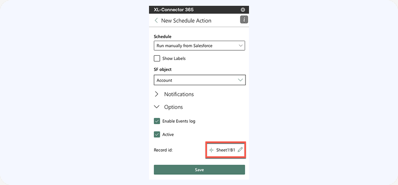 Now, when this flow is executed by a button click in Salesforce, the Id of the Salesforce record where the button was pressed will get recorded in the spreadsheet cell specified in the options.