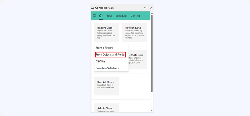 Open XL-Connector 365 from the Home ribbon in Excel and select the From Objects and Fields option from the Import data menu.