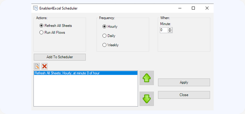 Clicking Apply in the dialog box will save the scheduler information in the spreadsheet and start it.