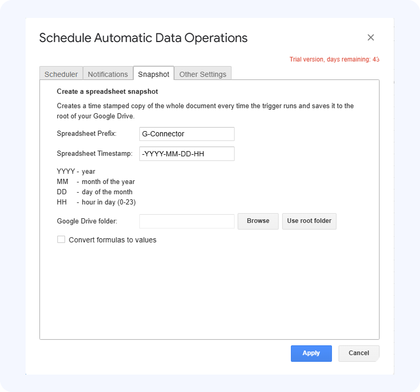To schedule taking of a snapshot of your spreadsheet, click on Document Triggers from the G-Connector for Salesforce menu. Then go to the Snapshot tab.