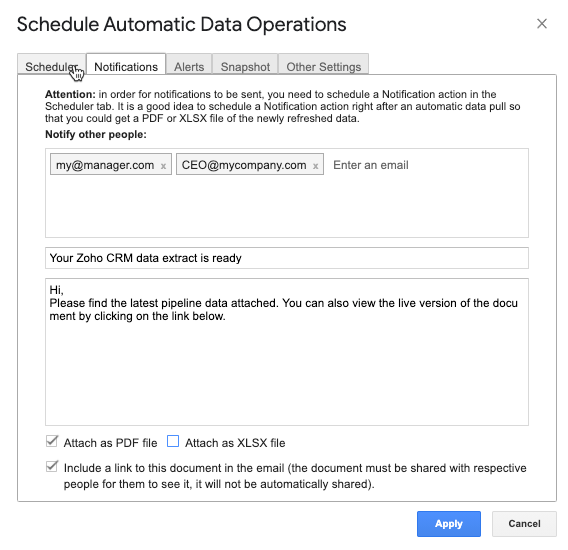 - Scheduling Automatic Data Alerts in G-Connector for Zoho CRM